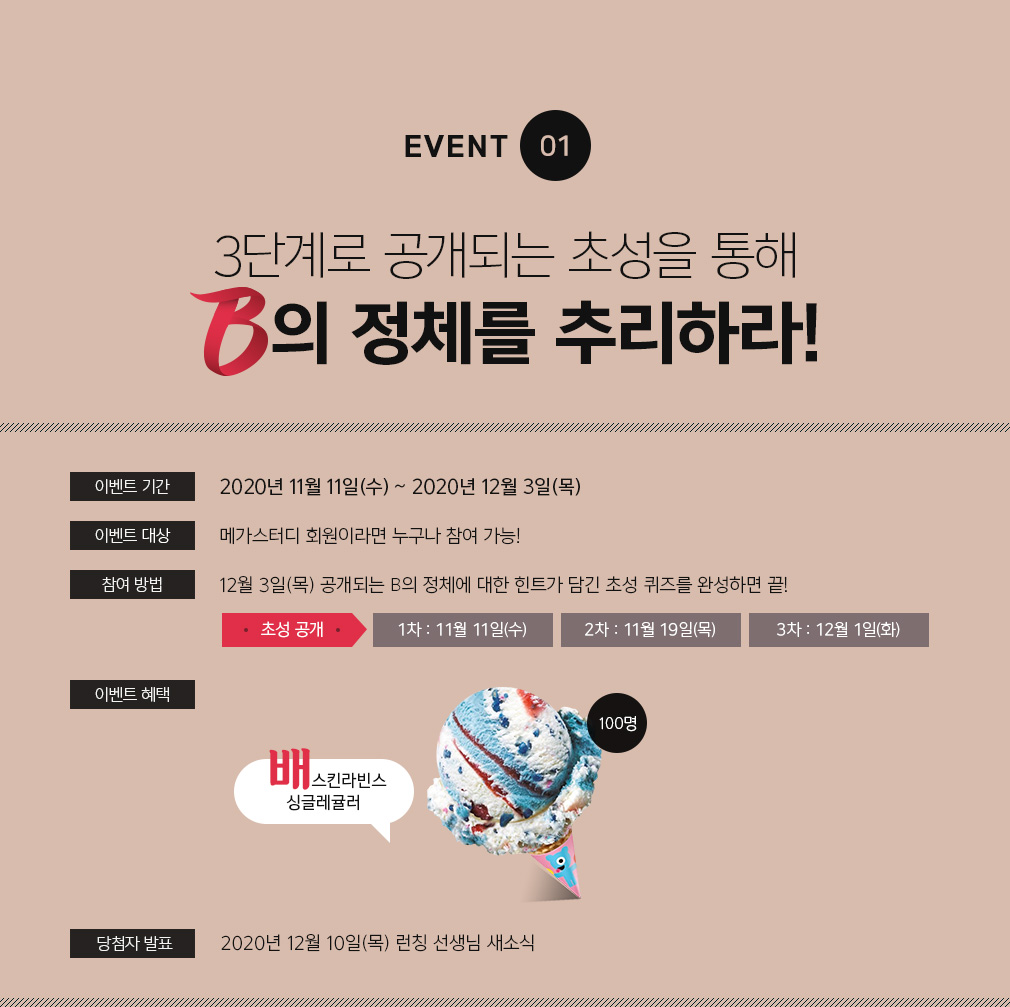 Ãʼº À̺¥Æ®´Â 1Â÷ : 11/11(¼ö), 2Â÷ : 11/19(¸ñ), 3Â÷ : 12/1(È) °¢ 0½Ã¿¡ ¾÷µ¥ÀÌÆ® µË´Ï´Ù.